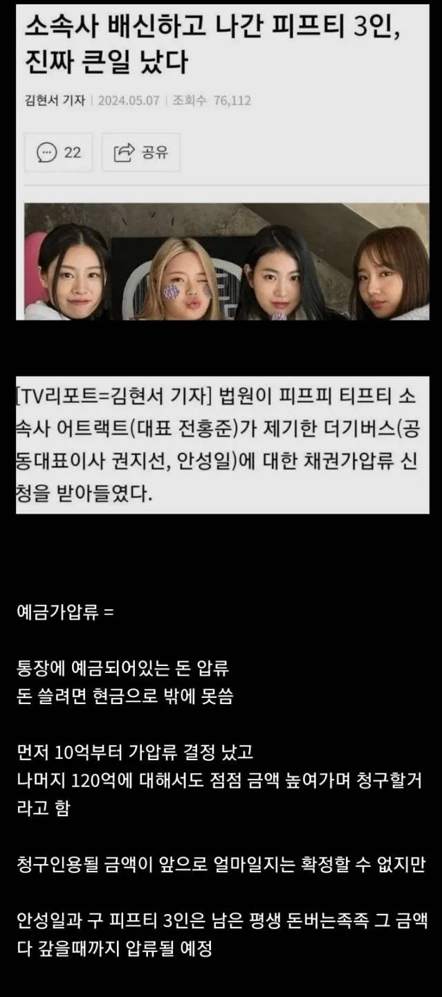 У статті йдеться про арешт депозитів з їхніх банківських рахунків на суму 12 мільярдів вон, на додачу до 10 мільярдів вон, попередньо арештованих у вигляді облігацій. Остаточна сума, яку повинні виплатити три учасниці та The Givers, ще не визначена.