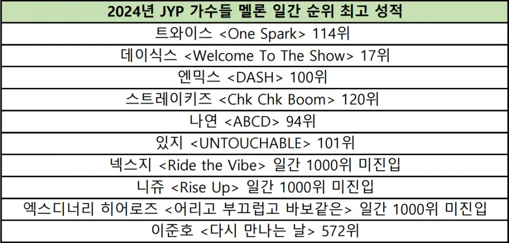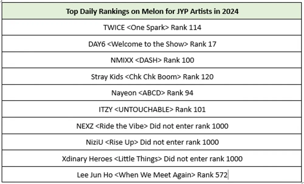 У 2024 році всі артисти JYP, крім DAY6, не потрапили в топ-20 на цифровому чарті Melon. Це викликало занепокоєння у деяких нетизенів щодо зниження популярності цих артистів, хоча інші бачать у цьому знак того, що JYP Entertainment уникає будь-якої маніпуляції з чартами.