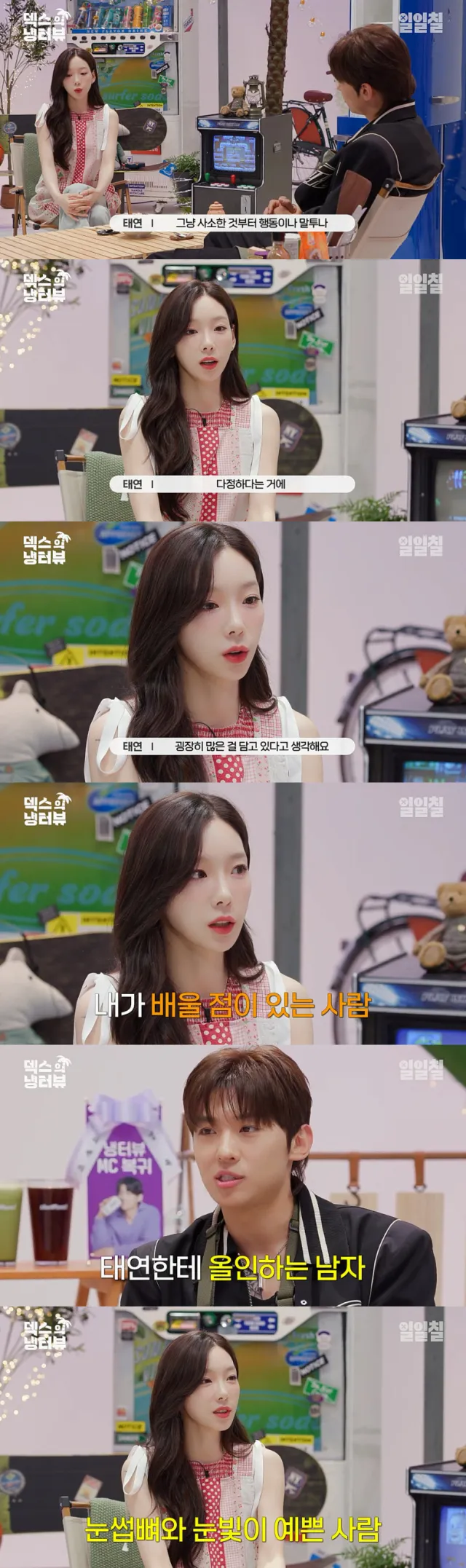 Dex підсумував: "Отже, твій ідеал чоловіка - це хтось, хто 'все для Taeyeon.' Чи можеш ти також описати свій фізичний ідеал чоловіка детально?" Taeyeon відповіла: