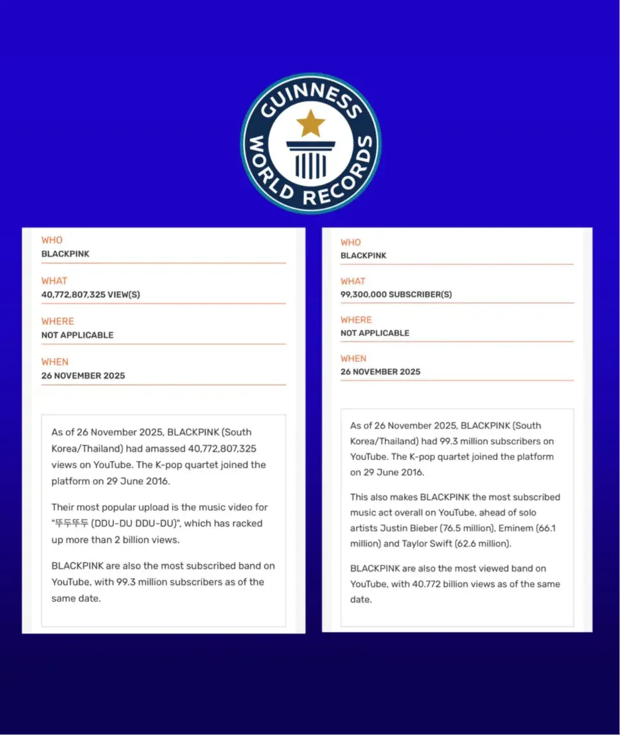 Згідно з останнім оновленням від Guinness World Records, офіційний YouTube-канал BLACKPINK досяг 99,3 мільйона підписників і перевищив 40,7 мільярда переглядів. Завдяки цим показникам гурт був офіційно визнаний рекордсменом у категоріях «Найбільша кількість підписників для гурту» та «Найбільша кількість переглядів для гурту» на YouTube у світі, обійшовши всіх інших міжнародно відомих артистів і ще раз підтвердивши своє абсолютне домінування на цифрових платформах.